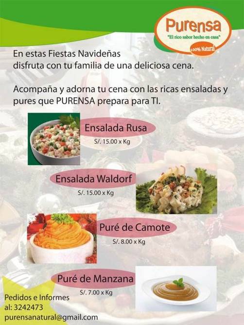 Este año les invito a probar de unas deliciosas ensaladas y purés naturales, hechos en casa, sin preservantes, para que lo puedan disfrutar en su cena navideña y también para año nuevo. Las presentaciones van desde 1/2 kilo.