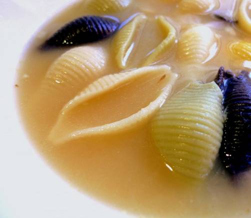 En nuestro caso añadimos unas conchas de pasta, dejamos cocer otro cuarto de hora, servimos y degustamos muy caliente.
