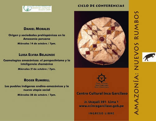 Continuando con el Ciclo de Conferencias "Amazonía Nuevos Rumbos", en esta oportunidad en el Centro Cultural Inca Garcilaso del Ministerio de Relaciones Exteriores(jr.Ucayali 391,Lima Cercado), el miércoles 14 de octubre a las 7p.m., estudioso Daniel Morales expondrá sobre el "Origen y sociedades prehispánicas en la Amazonía peruana". Sin lugar a dudas, un excelente tema que contribuirá a no dudarlo a una mayor comprensión de los pueblos amazónicos, de su cultura e historia. El ingreso a este acto académico es libre.