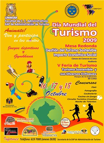 En el marco de la celebracion por el Dia Mundial del Turismo, la Universidad Nacional Mayor de San Marcos, a traves de su Escuela de Administracion de Turismo de la Facultad de Ciencias Administrativas, nos hace llegar su rol de actividades que entre concursos, mesas redondas y ferias se desarrollaran entre el 16 y el 18 de octubre.