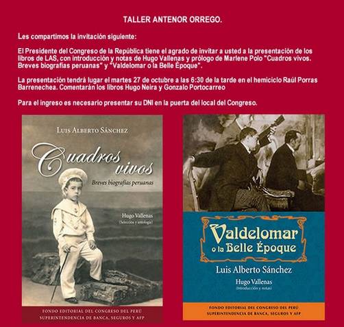 Compartimos la invitación a presentación de libros de Luis Alberto Sánchez, Martes 27 Octubre a las 6:30 pm. en el hemiciclo Raúl Porras Barrenechea