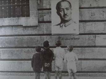 Unos niños ante un cartel de Francisco Franco durante la dictadura franquista.©UGT