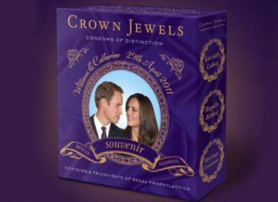 "Acuéstate y piensa en Inglaterra", es el mensaje que contiene la caja morada con la imagen de los futuros esposos.