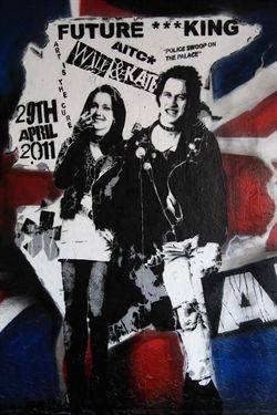 A apenas dos meses del enlace del Príncipe Guillermo y Kate Middleton, un nuevo y original graffiti ha aparecido en las calles del Southbank londinense. Y es que el artista Rich Simmons se ha atrevido a retratar como si del mismísimo líder de Sex Pistols se tratara a uno de los más firmes aspirantes a la corona inglesa. Envueltos en los colores de la bandera de Reino Unido y bajo un rótulo que reza 'Futuro Rey', el afamado pintor callejero ha dibujado a Guillermo y su prometida ataviados con un look de lo más roquero, al más puro estilo de Sid Vicious, vocalista de la conocida banda musical, y su novia Nancy Spungen.