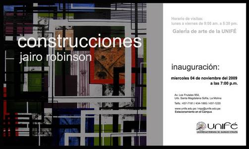 Construcciones es el título de la segunda muestra individual del artista peruano Jairo Robinson quien amparado en la más rigurosa abstracción geométrica, nos presenta un conjunto de obras que destacan por sus complejas configuraciones y su fino cromatismo cargado de veladas superficies y rotundas líneas negras. Los indicios de grandes vistas aéreas sugeridas por la presencia de los cuadrados y las líneas cruzadas nos hacen pensar en un misterioso mundo caótico plagado de oscuras sombras, formas flotantes y filosos contornos.