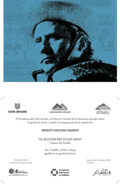 El Presidente del Club Ancash, Arce Trujillo Quezada tiene el agrado de invitar a la Exposicion sobre la vida de Ernesto Sanchez Fajardo, el "Jilguero de Huascaran", el jueves 5 de Noviembre desde las 7 de la noche.
