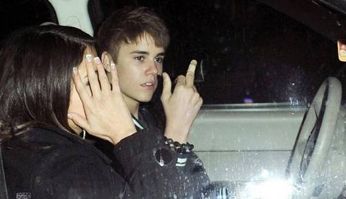 Justin en respuesta les dio una foto donde aparece haciendo una señal obscena con el dedo medio. A su lado, Selena Gómez se cubre el rostro para evitar a los paparazzi.