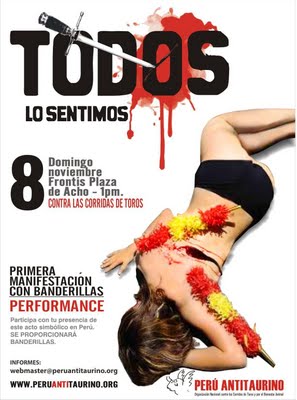 El propósito de esta actividad es sensibilizar a la opinión pública sobre lo inapropiado de mantener tradiciones crueles, como las corridas de toros, pues con ello no sólo se atenta contra indefensos animales, sino contra nuestro derecho a vivir una cultura de paz. Asimismo, exhortar a las autoridades políticas del país el debate y aprobación de nuestro Proyecto de Ley Nº 496, presentado por el Congresista José Urquizo Maggia, para la abolición de éste y otras formas de maltrato a los animales.En tal sentido, nuestros activistas se colocarán en la espalda unas banderillas, simulando el dolor y tortura que padecen los toros y con ello todos los animales, pues un toro en el ruedo es el símbolo de todo tipo de crueldad a los animales y muestra del poco respeto que se tiene por el medio ambiente.Cabe resaltar que en otros países ya se ha realizado este tipo de manifestación, pero es la primera vez que se ejecutará en Perú y esperamos que con la solidaridad y el compromiso de ustedes sea todo un éxito.Los activistas y personas en general que deseen ser parte de esta performance sin precedentes en Perú (se proporcionará banderillas), deben escribir dejando sus datos al siguiente correo: webmaster@peruantitaurino.orgDía y fecha: domingo 8 de noviembreLugar: frontis de la plaza de AchoHora: 1:00 p.m.