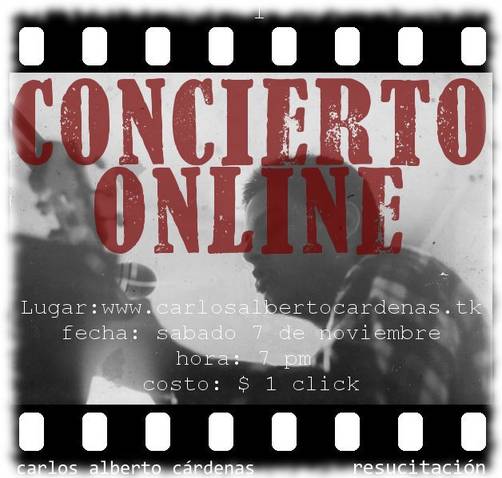 Carlos Alberto Cardenas, excelente cantaautor peruano, presenta su segunda producción, "Resucitación", con un especial concierto acustico online este 7 de noviembre a las 7 pm via www.carlosalbertocardenas.tk.Lo acompañan Pamela Bardalez en el chelo e Inkeri Petrozzi en el violin. Como invitado especial, el poeta Raúl Heraud.El disco puede descargarse y compartirse gracias a la licencia CC que posee en la misma página web.