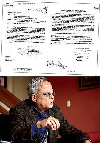 (1) Solicitud del ministro César Saucedo al ministro Jorge Baca pidiéndole una ampliación de 3’600,000 soles para el mes de agosto de 1998. Obsérvese el sello de “estrictamente secreto”. Derecha Acta de Verificación e Incineración (comprobante de gastos) Nº 006: la huella de 9’600,000 soles que debió quemarse pero que sobrevivió para la vergüenza de todos los peruanos. (2) César Hildebrandt dice que ya no hay dudas de que Fujimori es un ladrón