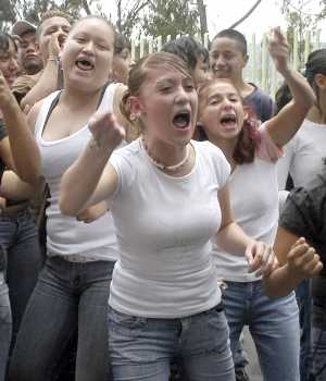 Un grupo de estudiantes protesta frente a la embajada chilena en Lima en contra de su carrera armamentista.