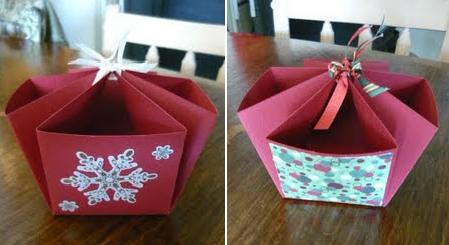 Materiales:Cartulina de colorPapel estampadoCola en barraTijerasReglaPerforadoraCordón o cinta finaPaso a paso:1. Comienza cortando un cuadrado de cartulina. Dóblalo en tres partes iguales verticalmente y horizontalmente marcando las líneas con la regla para que queden las partes iguales. En lo que serían los cuadrados centrales de cada lado puedes cortar cuadrados en papael estamapdo y pegarlos. En los cuadrados que quedan en las puntas debes doblar a la mitad diagonalmente y marcar con la regla.2. Da vuelta la cartulina una vez que tienes todas la slíneas dobladas y realiza en cada vértice una perforación.3. Toma las dos puntas de un lado y llévalas hacia el centro haciendo coincidir los dos agujeros. Ata con un trozo de cinta.4. Realiza los mismo con las dos puntas restantes y termina pasando la cinta por los cuatro agujeros. Realiza una moña y listo. Solo resta colocar lo que quieras dentro.