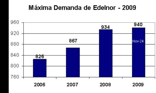 Sin embargo, este mes de noviembre, con un crecimiento sostenido de la demanda eléctrica, tal como la registrada por Edelnor, se empiezan a observar signos claros de recuperación económica. Es así que el día 24 de noviembre, Edelnor batió récord de demanda de energía, alcanzando los 940 MW, cifra superior a la máxima demanda del 2008 en que Edelnor registró una cifra histórica de 934 megawatios (MW).El incremento de la demanda se explica por un crecimiento uniforme en el mayor consumo de los clientes residenciales de Lima y Callao. Asimismo, el crecimiento de la demanda se explica también por el incremento de diversas actividades económicas como la pesca, elaboración de productos alimenticios y bebidas, fabricación de otros productos minerales no metálicos, entre otros.Esta cifra histórica sustenta el crecimiento y el fortalecimiento de la economía peruana, siendo el consumo eléctrico uno de los primeros indicadores del dinamismo que viene recuperando nuestra economía