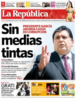 Mientras la carátula de La República de hoy pareciera que desea competir en humor con las caricaturas de Carlín, la pura verdad se impone y desenmascara la "lucha contra la corrupción" del doctor Alan García. Sin medias tintas el blog la Pura Purita nos muestra los convenios firmados por el despacho presidencial y la Universidad Alan Peruanas, perdón Alas Peruanas.Todo parece indicar que el país vive una situación de corrupción generalizada. Coincidimos en ese sentido con la apreciación de Fernando Rospigliosi acerca del comportamiento del gobierno sensible con los apristas y duro con quien no lo es (como si fuera una mafia dice Rospigliosi).Una reflexión final respecto a la rasgadura de vestidos del presidente García y sus ministros. La corrupción no busca gente decente para que la acompañe y la gente decente no acepta trabajar al lado de la corrupción, más aún cuando esta es tan evidente.Fuente: Mate Pastor