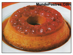 5.Colocar las cerezas en la base del molde caramelizado y por encima verter el flan. Hornear a baño de maría a 170C durante 30 a 40 minutos.