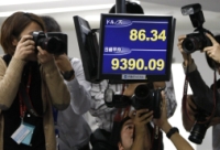 Fotógrafos japoneses ante una pantalla electrónica que registra la caída del dólar frente al yen, su más bajo nivel en 14 años, el 26 de noviembre. Foto: Reuters