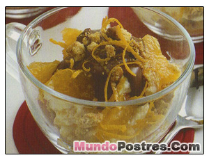 1. Fundir el chocolate a baño Maria ( o en el microondas, a temperatura alta, 2 minutos) y remover a mitad del proceso. Agregar la mitad de la corteza de naranja y reservar.2. Batir el azúcar con el queso y añadir con movimientos envolventes las piezas de naranja. Dividir las galletas machacadas entre cuatro tazas y volver la mezcla de queso. Rociar la salsa de chocolate, añadir por encima la corteza restante y servir. Este postre se puede comer al momento; pero para darle un toque crujiente se puede refrigerar 20 minutos.Fuente: Mundopostres