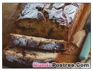 1. Precalentar el horno a 180’C. Engrasar y formar un molde rectangular. Hervir los albaricoques con el jugo de naranja 5 minutos a fuego lento y luego dejar enfriar.2. Batir la mantequilla, el azúcar, los huevos, las almendras, la harina y la leche, hasta conseguir una masa uniforme. Agregar los orejones, los chips de chocolate y las dos terceras partes de las nueces.3. Volcar en el molde y nivelar la superficie. Repartir el resto de nueves y cocer hasta que, al introducir un pincho en el centro, salga limpio. Dejar enfriar 5 minutos, ponerlo sobre una rejilla y espolvorear el azúcar glasé. Enfriar completamente y servir.Fuente: Mundopostres
