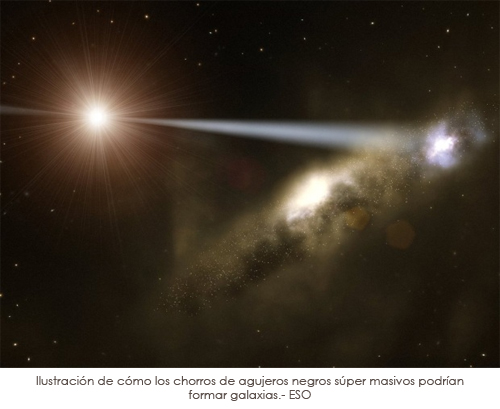 En la evolución del Universo los astrofísicos se preguntan qué viene primero: los agujeros negros súper masivos que devoran materia frenéticamente o las enormes galaxias donde éstos residen. Una serie de recientes y extraordinarias observaciones de un agujero negro huérfano (no está en el centro de una galaxia) indican que puede estar construyendo su propia galaxia madre. En tal escenario, las galaxias habrían evolucionado a partir de nubes de gas golpeadas por los chorros de partículas de gran energía que emergen de los agujeros negros.