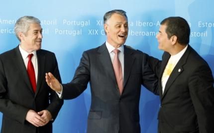 El primer ministro y el presidente de Portugal acogen al presidente de Ecuador, Rafael Correa (d), a su llegada a la cumbre de Estoril. ©Reuters