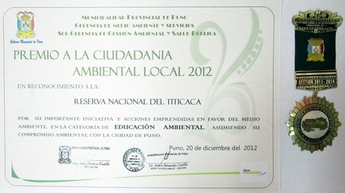 El Gobierno Municipal de Puno otorgó al Servicio Nacional de Áreas Naturales Protegidas por el Estado – SERNANP, a través de la Reserva Nacional del Titicaca, el Premio de Ciudadanía Ambiental Local 2012. La Reserva Nacional del Titicaca destacó en la categoría de Educación Ambiental, recibiendo un diploma, la medalla verde de la ciudad y un estandarte en ceremonia realizada en la Casa de la Cultura de la ciudad de Puno. El premio se le otorgó a esta Reserva Natural como un reconocimiento a las labores de educación ambiental que se desarrolló de abril a noviembre del año pasado, en diez instituciones educativas de cinco distritos de la región Puno, ubicados en la zona de amortiguamiento del Área Natural Protegida. Durante esta actividad se conformaron diez Brigadas Ecológicas Escolares, en las que participaron 25 alumnos en cada una de ellas. Cabe destacar que la Reserva Nacional Titicaca tiene experiencia en brigadas ecológicas que va más allá de las charlas de educación ambiental, sino también actividades prácticas en campo, jornadas de limpieza en sus zonas y formación de difusores de buenas prácticas ambientales en sus comunidades. El Premio de Ciudadanía Ambiental Local tiene como objetivo identificar, reconocer y destacar las buenas ideas, proyectos y actitudes innovadoras en beneficio del ambiente, que realizan personas, grupos organizados, empresas, instituciones públicas y otros actores de la sociedad civil.