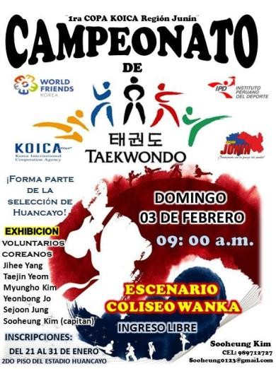 El Consejo Regional del Deporte - Junín y los Voluntarios de la Agencia KOICA, invitan a los niños y jóvenes de todas las Instituciones Educativas, clubes afiliados, aspirantes y fanáticos de este deporte olímpico a participar en el I Campeonato de Taekwondo “Copa Koica Región Junín”, el mismo que se desarrollará el próximo domingo 03 de febrero, en las Instalaciones del Coliseo Wanka desde las 09:00 a.m. Para este gran evento se ha coordinado la llegada de 5 deportistas de nacionalidad coreana, (Jihee Yang, Taejin Yeam, Myungho Kim, Yeonbong Jo, Sejoon Jung), los mismos que demostrarán todas sus habilidades en una significativa exhibición siendo ellos los encargados de la calificación por categoría y modalidad, de esta manera tener a los mejores representativos y conformar la Selección Regional que estarán bajo la dirección de Sooheung Kim, técnico de la Escuela de Formación Deportiva de Taekwondo que promueve el IPD-Junín.Los informes, inscripciones y entrega de bases se realizarán hasta el 31 de enero en las oficinas del IPD-Junín, sito en el 2do Piso del Estadio Huancayo, Voluntario de KOICA, Soogeung Kim Cel.: 989712727.