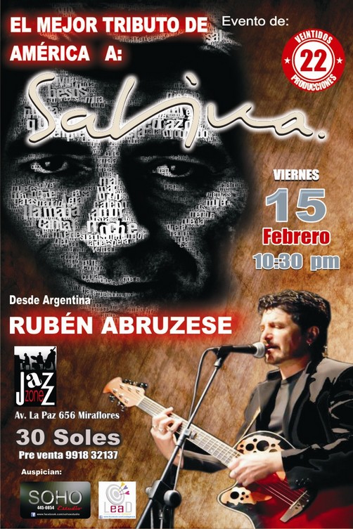 Con cinco discos homenaje y la experiencia de haber compartido escenario con el propio Joaquín Sabina, el argentino Rubén Abruzese, arribará a nuestro país con "El mejor tributo de América a Sabina", que será presentado este 15 de febrero en el Jazz Zone con un show acústico y el 16 en La Noche de Barranco, el argentino realizará un espectáculo con banda, coros y un invitado especial.Rubén Abruzese, prepara junto a su banda, un show pleno de éxitos del cantautor español, donde no faltarán temas como "19 días y 500 noches", "Princesa", "Contigo", "Y si embargo", "Por el boulevard de los sueños rotos", entre otros. El sábado 16 de febrero a las 10pm en La Noche de Barranco, Abruzese, presentará un set especial de “Enemigos Intimos” contando con la participación especial de Luis Yarleque, el imitador de Fito Páez. Los boletos para las dos fechas se venderán en las boleterías de cada local. Cabe señalar que las entradas para el show del Jazz Zone costarán 30 soles, mientras que para el espectáculo en La Noche de Barranco , los boletos estarán valorizados en 50 soles y también estarán a la venta en la boletería del mencionado local. VIDEOS Y SIN EMBARGOhttp://youtu.be/aUcdWbtXvjcEL ROCK AND ROLL DE LOS IDIOTAShttp://youtu.be/6VriSISXnZwY NOS DIERON LAS DIEZhttp://youtu.be/H5kY_ie0e8oDATOEntrada Jazz Zone - show acústico s/30Entrada La Noche de Barranco - Show con banda, coros y Set "Enemigos íntimos" en dúo con el Fito Páez peruano. Pre venta s/ 45.00 al 9918 32137.