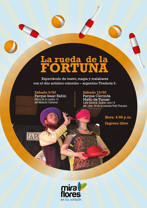 La Municipalidad de Miraflores invita a participar en las dos funciones de La rueda de la fortuna, un espectáculo de humor, magia y misterio con el dúo colombo – argentino Tómbola Seis, que se estará presentando este sábado 9 y 16 de febrero en los parques del distrito. De esta manera, Tómbola seis – conformado por los artistas Selene y Coco Casino- hace su primera presentación en nuestro país para brindar un espectáculo abierto que reúne ocho misteriosos juegos de destreza, telepatía, adivinación y magia, que divertirá y sorprenderá a los asistentes. Demostraciones telepáticas con el público, fuga de una camisa de fuerza, revisada y amarrada por espectadores, adivinación con los ojos completamente vendados y memorización en pocos segundos de un sin límite de palabra, son sólo algunos de los retos que se han preparado para esta ocasión. Los invitamos a disfrutar de esta doble función que se presentará en el Parque Isaac Rabin (6/2) y Clorinda Matto de Turner (16/2), en donde la combinación del teatro, la magia, los malabares y el humor se hacen realidad para ofrecer un espectáculo único que asombrará a grandes y chicos. Tómbola seis Dúo artístico conformado en 2011 en la ciudad de Bogotá, Colombia. Se caracteriza por presentar espectáculos para todo tipo de espacios (salas, calle y espacios no convencionales) que fusionan diversas ramas artísticas escénicas como el teatro, la magia, el mentalismo, el escapismo, el clown y los malabares, tanto para niños como para adultos. Han participado en los siguientes festivales internacionales: III Festival Internacional de Teatro en Engativá y X Entepola (Bogotá, 2012), IX Festival Internacional Zigzag (Riobamba, 2012), III FITECA Ecuador (Santo Domingo, 2012) y XIV Entupe (Encuentro de teatro universitario y politécnico de Ecuador, Guayaquil 2012). También se han presentado en salas, bares, plazas y colegios en las ciudades de Bogotá, Pasto (Colombia), Quito, Ambato, Ibarra, San Jacinto (Manabí), Machala, Guayaquil, Riobamba, Santo Domingo , Guaranda (Ecuador), Los Organos, Piura , Trujillo y Lima (Perú).Actualmente se encuentran en una gira sudamericana, con la intención de llevar y compartir su arte y enseñanzas por los pueblos hermanos del continente, con la convicción de que el arte se engrandece con el intercambio humano y cultural. Funciones: Sábado 9/02 Parque Isaac RabinAltura de la cuadra 12 del Malecón Cisneros Sábado 16/02 Parque Clorinda Matto de TurnerCalle General. Suárez cdra.14(alt. cdra. 44 de la avenida Petit Thouars) Hora: 4:00 p.m.INGRESO LIBRE