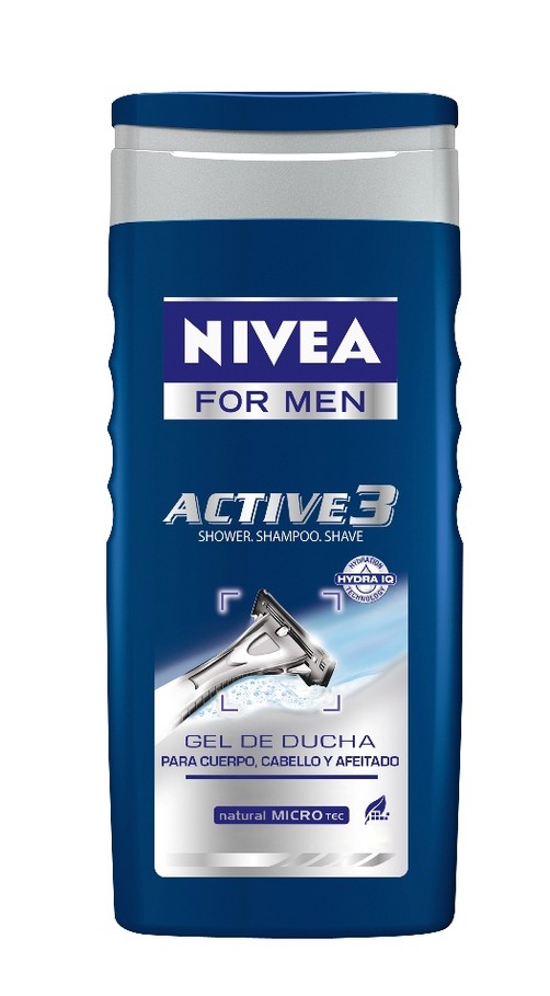 Nivea for Men presenta su más reciente innovación "Active 3", el cual ofrece 3 beneficios en un solo producto: shampoo, gel de afeitar y shower gel. Gracias a su fórmula con complejo Vitamínico F ofrece una suave limpieza del cabello y cuerpo, y prepara la piel antes del afeitado.