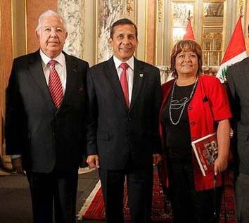 Izquierda: Ollanta Humala en la ceremonia de promulgación, acompañado del presidente del Congreso, Víctor Isla, y el canciller Rafael Roncagliolo. Derecha: El Presidente de la República Ollanta Humala en la ceremonia de promulgación, acompañado del presidente de la Federación Mundial de Instituciones Peruanas ( FEMIP) Julio A. Salazar Moscoso, y Norberto Curitumai.