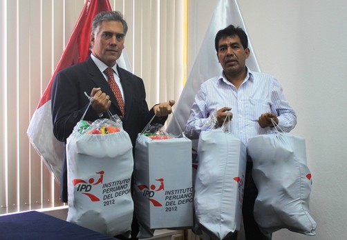 En ceremonia realizada esta mañana en el Salón de la Presidencia, el Instituto Peruano del Deporte, representado por su titular Francisco Boza, hizo entrega de cuatro kits deportivos a la Municipalidad Distrital de Tamburco, Provincia de Abancay, Región Apurímac, representado por su Alcalde, Fernando Zúñiga Gutierrez.
