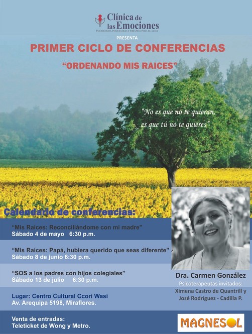 Clínica de las Emociones, presenta el primer ciclo de conferencias "Ordenando mis raíces" con la doctora Carmen González, mañana sábado 4 de mayo del 2013, a las 6:30 pm, en el auditórium Ccori Huasi, de la Av. Arequipa 5198, Miraflores. En este ciclo de conferencias además estarán los psicoterapeutas Ximena Castro de Quantrill y José Rodríguez-Cadilla. Pensando en lo decisivo que es para el ser humano esa primera relación que es con la madre, y que ese vínculo marca -a veces invisiblemente- todos los demás vínculos de nuestra vida; y que nuestros amores, odios y miedos tienen la huella de esa raíz, estoy haciendo una Conferencia Terapéutica denominada "Reconciliándome con mi Madre", (aunque ya no esté con nosotros), para que cada uno de los asistentes pueda ver aliviarse al reconocer la razón de muchos de sus actos, a los que a veces no les halló el sentido o la explicación y que pueda tener un poquito más de paz interna. Esta conferencia es para los hijos, los padres, los que van a ser padres, las parejas, los hermanos… mejor dicho para todos. Entradas en Teleticket de Wong y Metro. Los temas de este ciclo de conferencias “No es que no te quieran, es que tú no te quieres”. Serán: Mis Raíces: "Reconciliándome con mi madre" Sábado 04 de Mayo 6:30pm Mis Raíces: "Papá, hubiera querido que seas diferente" Sábado 8 de Junio 6.30pm. Mis Raíces: "SOS a los padres con hijos colegiales" Sábado 13 de Junio 6.30pm.