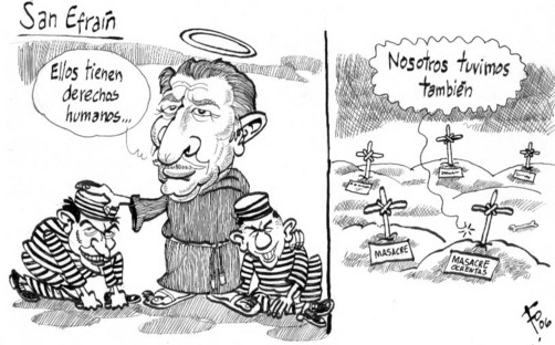 En el Hospital Militar, ubicado en la periferia este de la capital guatemalteca, también está internado el antiguo jefe de inteligencia de Ríos Montt, otra joyita genocida, el general retirado José Rodríguez, quien fue absuelto de los mismos cargos. Ríos Montt fue hallado responsable de 15 masacres a manos del Ejército en las cuales murieron 1,771 indígenas mayas-ixiles en el departamento de Quiché (norte), durante su régimen de hierro entre 1982 y 1983, el más álgido de la guerra de 36 años (1960-1996) que dejó 200,000 muertos o desaparecidos, según un informe de la ONU. Se espera que su dios lo salve como buen pastor evangélico y que su colega Alberto Fujimori aprenda la lección.