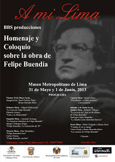 El 31 de Mayo, de 4:00 a 8:00 p.m. y el sábado 1 de junio, de 9:00 a.m. a 1:00 p.m., en el Auditorio Taulichusco del Museo Metropolitano de Lima, ubicado en el Parque de la Exposición (av.28 de julio entre Garcilaso de la Vega y Petit Thouars), se llevará a cabo el Homenaje y Coloquio “A mi Lima”, a Felipe Buendía, conmemorándose 10 años de su fallecimiento.
