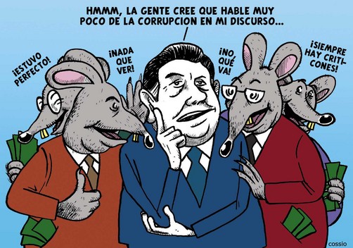 Y la corrupción no tiene bandera ni ideología. Estamos bajo la fachada de un gobierno nacionalista cuyos funcionarios se equiparan a lo peor de los gobiernos aprista, toledista y fujimorista. Todos roban, todos piden de la suya, todos tratan de lograr su “bolsita”, de sacar alguito. ¡No hay diferencia!.
