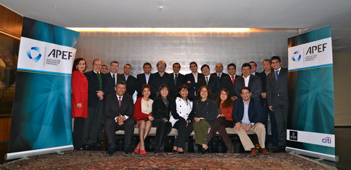 Con la asistencia de los importantes ejecutivos de nuestro medio la Asociación Peruana de Finanzas, APEF, realizó otro de sus concurridos “After Office” en el salón principal del Club de la Banca y Comercio. En la reunión estuvieron presentes Mario Ernesto Ochoa Ponte, Cecilia Matsuno Fuchigami, Nelson Carlos Enrique Dávalos, Arnold Martell Hurtado, Segundo Capristán Núñez, Doménico Casaretto, Illich de Almeida Rotta, Félix Novoa Herrera, Luis Scerpella Robinson, Luis Guzmán Pardo Figueroa, Jaime Aranda Gutiérrez, José A. Salinas Lostaunau, Jaime Luis Rivero Aguilar y Christian Fernández Obando entre otros. La APEF es una asociación sin fines de lucro formada por un grupo de profesionales en finanzas de destacadas empresas del país. Su presidente es Alejandro Gómez Saba, economista y MBA por la Universidad del Pacífico y programa de Desarrollo Directivo del Instituto de la Empresa de España. El cargo de Secretario es ejercido por Segundo Capristán Núñez, contador y administrador con Maestría en Administración Estratégica de Empresas por la PUCP y MBA in General and Strategic Management por Maastricht School of Management de Holanda; y Félix Novoa Herrera, contador público de la Universidad del Pacífico, con un MBA de la Universidad Esan, es quien asume la función de Tesorero de la organización.