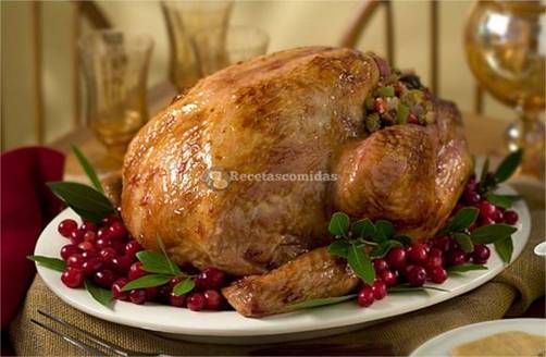 Después de la primera hora, sacar la fuente y con una cuchara grande de madera cubrir la parte arriba del pavo con el jugo que se estará acumulando en el fondo de la fuente. Colocar las castañas restantes y dos cebollas pequeñas cortados en 4 trozos en la fuente. Volver a introducir la fuente en el horno, esta vez destapada para la segunda hora de cocción. Servir con verduras al vapor (por ejemplo, brocoli, coles de bruselas, zanahorias, patatas asadas...), y regar con una buena rioja.Fuente: Gallinablanca