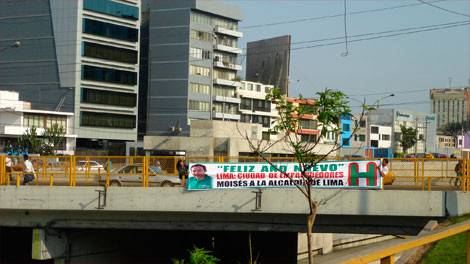 Esta mañana sorprendió a las personas que transitan por la Vía Expresa de Paseo de la República la aparición de carteles que desean un año nuevo y a la vez promocionan a “Moisés” a la alcaldía de Lima, por parte de militantes delPartido Humanista Peruano (PHP) que preside el congresista Yehude Simon.