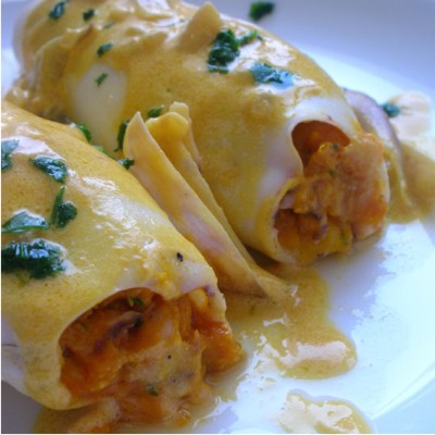 Ingredientes700gr calamares2 cebolla1 diente de ajo1 huevo100gr jamon serrano300gr calabacinperejil1 cucharada harina1 bote Sofrito de Tomate y Cebolla de Gallina Blanca2 vasos vino blancopimientaaceite de olivasalPreparaciónLimpiar los calamares y picar los tentaculos y las aletas. Fríe el calabacin y reservalo. Pica la cebolla y el ajo y frielos hasta que la cebolla se dore. Añade el jamón picado y la picada del calamar, y rehógalo.
