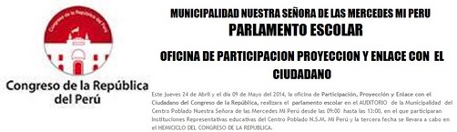 Este jueves 24 de Abril y el día 09 de Mayo del 2014, la oficina de Participación, Proyección y Enlace con el Ciudadano del Congreso de la República, realizara el parlamento escolar en el AUDITORIO de la Municipalidad del Centro Poblado Nuestra Señora de las Mercedes Mi Perú desde las 09:00 hasta las 13:00, en el que participaran Instituciones educativas del Centro Poblado N.S.M. Mi Perú, en donde se tiene programada la tercera sesión en el HEMICICLO DEL CONGRESO DE LA REPUBLICA. Para lo cual se ha programado la formación de 10 grupos parlamentarios (bancada), cada uno con el mismo nombre de su institución educativa, procediendo luego a elegir a los voceros Parlamentarios por los integrantes de cada bancada; de igual manera se elegirá a los miembros de la Mesa Directiva elegidos por el pleno, que lo integran un presidente y tres vicepresidentes.