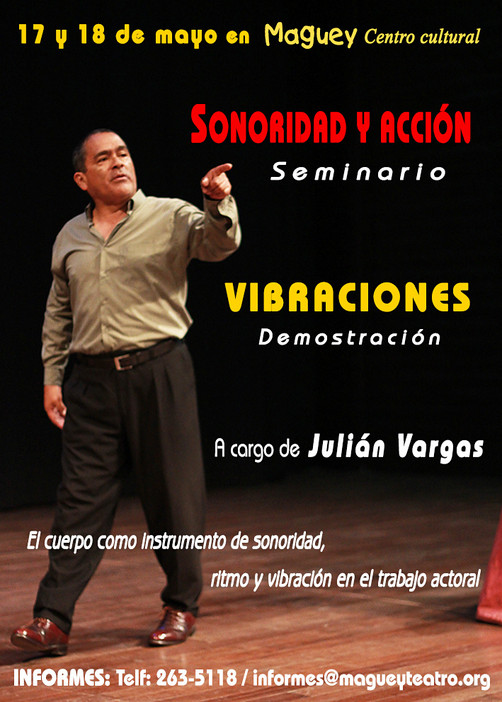 Maguey Teatro impulsa el intercambio, la investigación y la pedagogía teatralEl Grupo de Teatro Maguey y su Laboratorio-Escuela Lunanueva recibirán en su Centro cultural de San Miguel al experimentado actor, músico y pedagogo Julián Vargas, miembro del Grupo Yuyachkani, quien dictará un seminario-taller práctico para actores, artistas escénicos, músicos, bailarines, estudiantes y público en general, interesado en recibir su valiosa experiencia en la investigación del trabajo del actor vinculado al sonido, el ritmo y la acción.El último día del seminario denominado Sonoridad y Acción, Julián Vargas presentará su demostración de trabajo llamada Vibraciones, un valiosísimo compendio vivo y espectacular de su vasta trayectoria artística de más de cuarenta años en los que ha recorrido el Perú, Latinoamérica y Europa visitando los más prestigiosos escenarios. Esta demostración dirigida por Miguel Rubio Zapata, se desarrolla entre la maestría de una sesión pedagógica y la cálida contundencia de una estructura espectacular. Vibraciones estará abierta también al público en general.