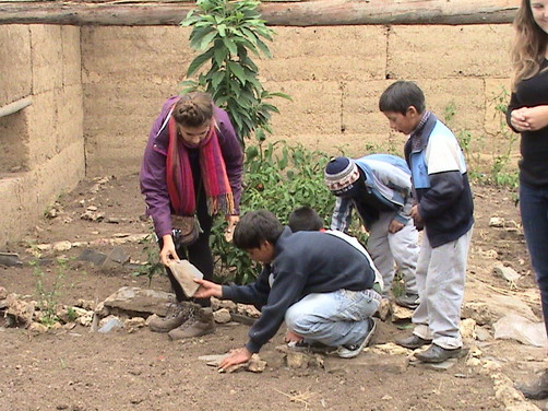 En este día de visita al Biohuerto Educativo, los alumnos de la institución trabajaron al lado de su profesora y de nuestras jóvenes voluntarias en los caminos entre parcela y parcela.