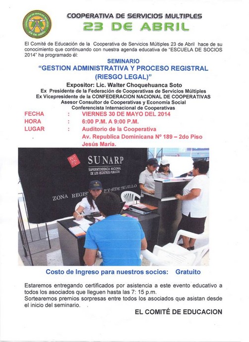 CONFERENCIA MAGISTRAL: “GESTION ADMINISTRATIVA Y PROCESO REGISTRAL” (Riesgo Legal en las Cooperativas) 30-05-2014 .- Renovación de Tercios e Inscripción de Elecciones (Proceso Electoral 2014) .- Poderes de Gerente- Remociones de dirigentes .- REFORMA DE ESTATUTO Y TRANSFORMACION- FUSION DE COOPERATIVAS .- CONVOCATORIAS DE CONSEJO DE VIGILANCIA .- ASAMBLEA UNIVERSAL- DE REGULARIZACION Y DE RATIFICACION .- Tachas- Rogatorias- reaperturas- Apelaciones al Tribunal