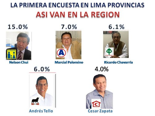 A dos meses y quince días de llevarse las elecciones regionales y municipales, una encuestadora privada realizo una encuesta regional en las nueve provincias de esta región (Huaura, Cañete, Barranca, Huaral, Oyón, Cajatambo, Huarochirí, Canta, y Yauyos. Los días 13, 14,15, 16 de Julio – 2014.