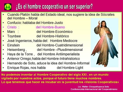 ¿ES EL HOMBRE COOPERATIVO UN SER SUPERIOR? No podemos inventar al hombre cooperativo del siglo 21, en un mundo vigilado por nuestros actos, porque el futuro tiene muchos nombres, lo que podemos hacer es incubar en la juventud los” Valores Cooperativos”