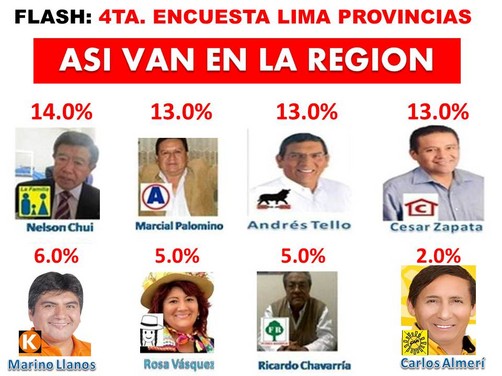 A veinte días de llevarse las elecciones municipales y regionales según una encuestadora privada de prestigio, realizo un sondeo en la región Lima, en las nueve provincias como: Huaura, Barranca, Huaral, Canta, Oyon, Cajatambo, Cañete, Huarochirí y Yauyos. Este importante sondeo se llevó a cabo los días 8, 9, 10 y 11 de Septiembre de 2014.