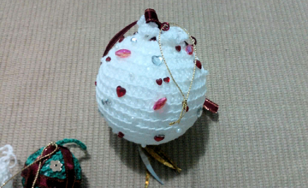 En la bocha más grande se deben realizar aumentos al comenzar la labor y las disminuciones al finalizar la labor de acuerdo al tamaño de bochas que utilicemos, decorar a gusto, en el caso de la esfera más grande le coloqué piedritas acrílicas (que vienen para pegar en el celular), en forma de corazones o lo que quieran y también tiene perlitas, lentejuelas y para colgar le pase por el centro de la esfera alambre aluminio color rojo terminado con un rulo por donde pasa un cordón dorado para colgar en nuestro arbolito navideño.Fuente: LasManualidades