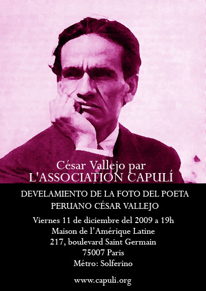 La Casa de América Latina, la única institución oficial de todos los eventos culturales latinos, con sede en pleno corazón de París, ha sido por años el lugar preferido para honrar la memoria de César Vallejo, organizándose conferencias, debates, presentación de sus libros, traducciones y hasta representaciones artísticas de todo género. En dicho recinto existe una galería de fotos de los más ilustres escritores y poetas tales como Borges, Cortázar, Octavio Paz, entre otros, pero hasta la fecha, no existe una foto o imagen del poeta Santiaguino, por ello y para cubrir esta ausencia imperdonable a la memoria del vate, la Asociación Cultural Peruana CAPULÍ, en el marco de la clausura de su agenda cultural de este 2009 que ya se nos va, otorgará y develará una réplica de la foto clásica de César Vallejo y Georgette que fue tomada en 1929 en Versailles, inmortalizando su imagen. Acto seguido, se rendirá un homenaje a Georgette Vallejo, pues el 4 de diciembre su cumplieron 25 años de su desaparición física en el Perú. Igualmente se hará mención del libro del profesor Miguel Pachas Almeyda quien édito el año pasado un libro acerca de la biografía completa de la esposa del autor de Trilce : »Al final de la Batalla » Cabe resaltar también que la Editorial Flammarion publico la segunda edición de la « Poesìa Completa » traducida al francés en abril del presente año, acontecimiento importante, pues la primera edición salió hace más de 20 años ! Este evento terminará con extractos de las dos últimas performances en video realizadas por los fundadores de Capulí, los mellizos Manuel y Ántero Moreno-Salvador : »Oda a Vallejo » (2008) y « Oda a Georgette » (2009) La cita, que ha causado expectativa en el medio galo, sera este viernes 11 de diciembre en La Maison de l’Amérique Latine, 217, Bld. Saint Germain, Paris, Metro Solferino, a las 19h00.