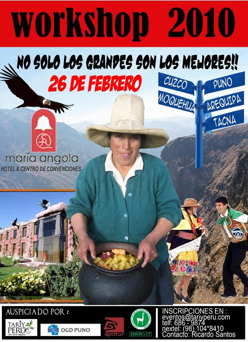 Como parte de su campaña promocional, los organizadores del Workshop 2010 Turismo Rural, Vivencial y Comunitario -D&W Perú y Hoteles del Sur- colocaron en Internet el banner publicitario de este evento, el cual viene generando inmensas expectativas entre las empresas protagonistas del sector turístico. La visualización de dicho banner -‘colgado’ en www.tariyperu.com- permitirá que las personas y empresas que deseen participar en el workshop conozcan más del evento; tanto como la sede y los temas que se desarrollaran. Como indica el banner promocional, la cita será el próximo 26 de febrero en el Hotel María Angola. Para mayores informes escribir al correo eventos@tariyperu.com o llamar al 686-9874.