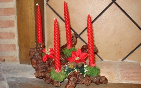 Materiales:- Cepa- Tinte al agua- Barniz- Lija- Cuchillo- Cepillo de alambre- Brocha- Cola caliente- Plastelina- Musgo- Flores navideñasInstrucciones:Se coge una cepa la que más te guste. Se limpia bien, es decir, se descascarilla toda la corteza de la cepa con ayuda del cuchillo, lija y cepillo de alambre. Se tinta al gusto de cada persona, y después de estar seca se barniza.